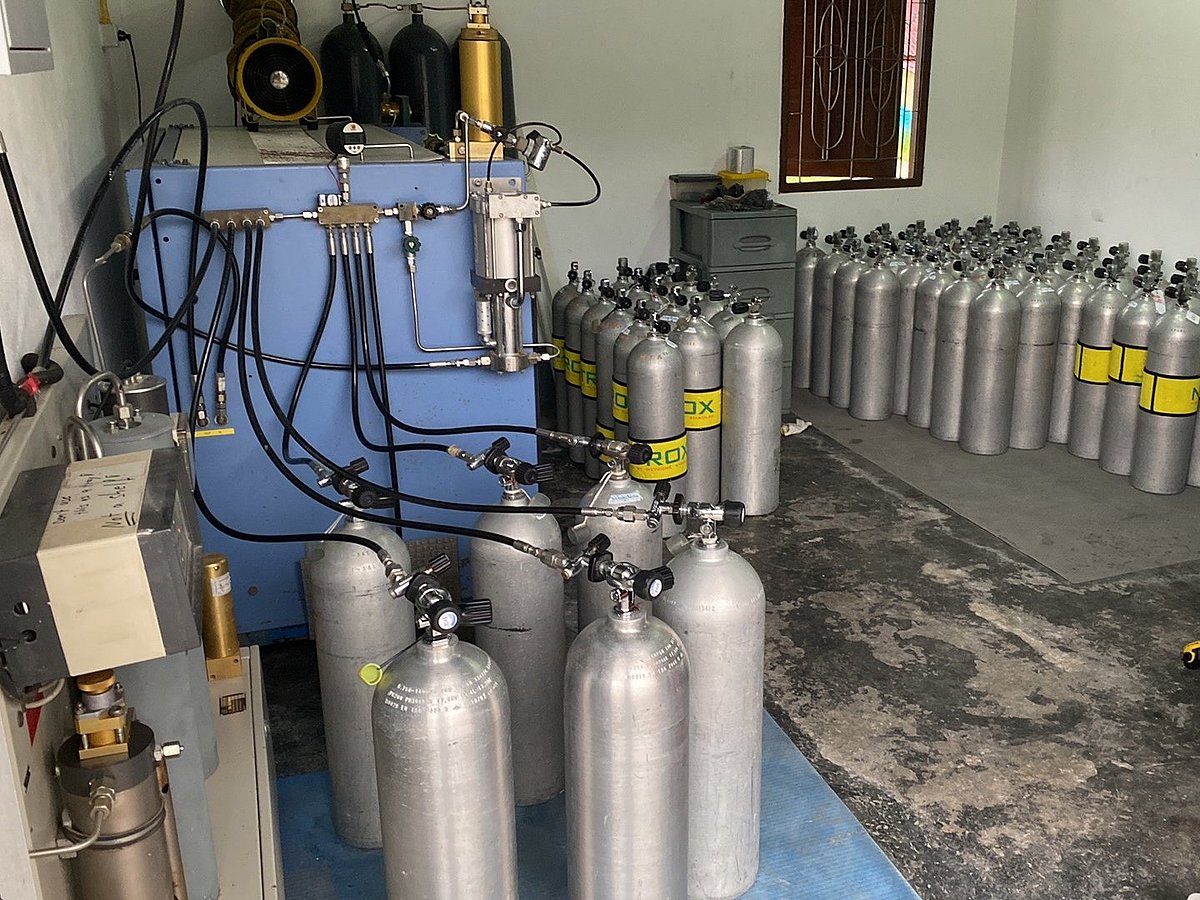 Nous disposons d'un compresseur moderne Draeger Super Silent (460 l/min) et produisons de l'air enrichi à 32 % en utilisant la méthode de pression partielle, que nous remplissons dans des bouteilles en aluminium de 12 litres.