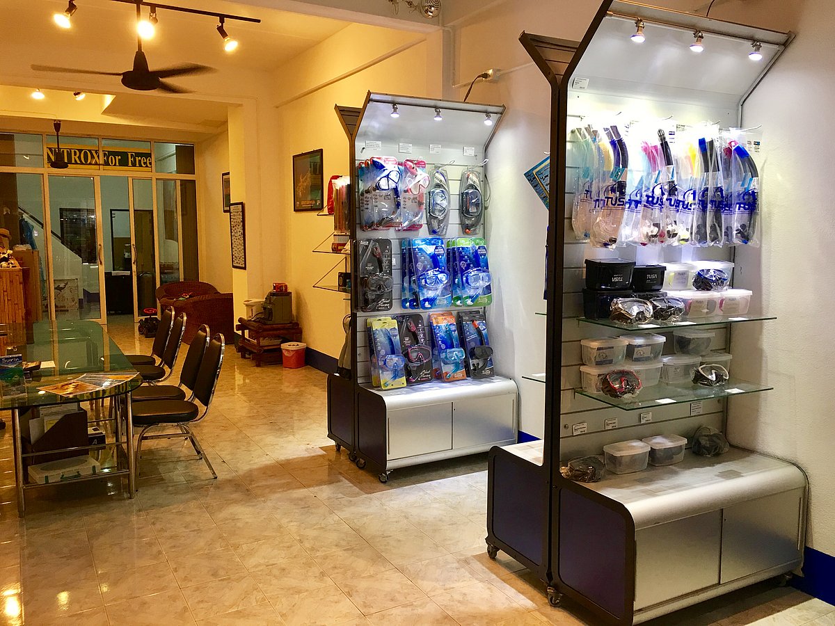 Dans le centre de plongée, il y a également une zone boutique où des t-shirts, des vestes, des bouées, des carnets de plongée, des combinaisons et autres accessoires de plongée sont proposés à des prix abordables.