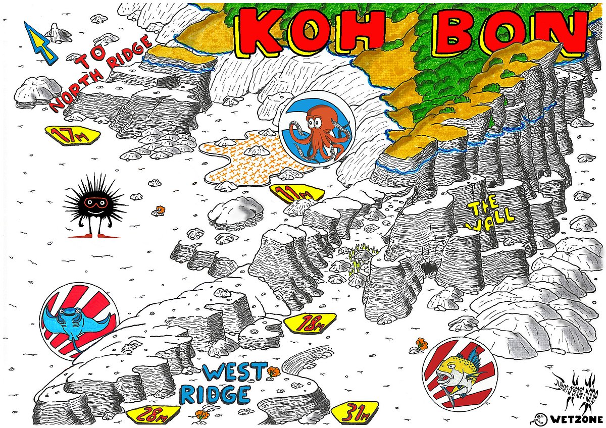 Der Tauchplatz Koh Bon ist besonders bekannt für seine großen Meeresbewohner, insbesondere für Begegnungen mit Mantarochen. Die Chancen, Mantas zu sehen, sind hier sehr hoch. Die Insel hat zwei Haupt-Tauchplätze: Koh Bon Pinnacle und Koh Bon West Ridge.